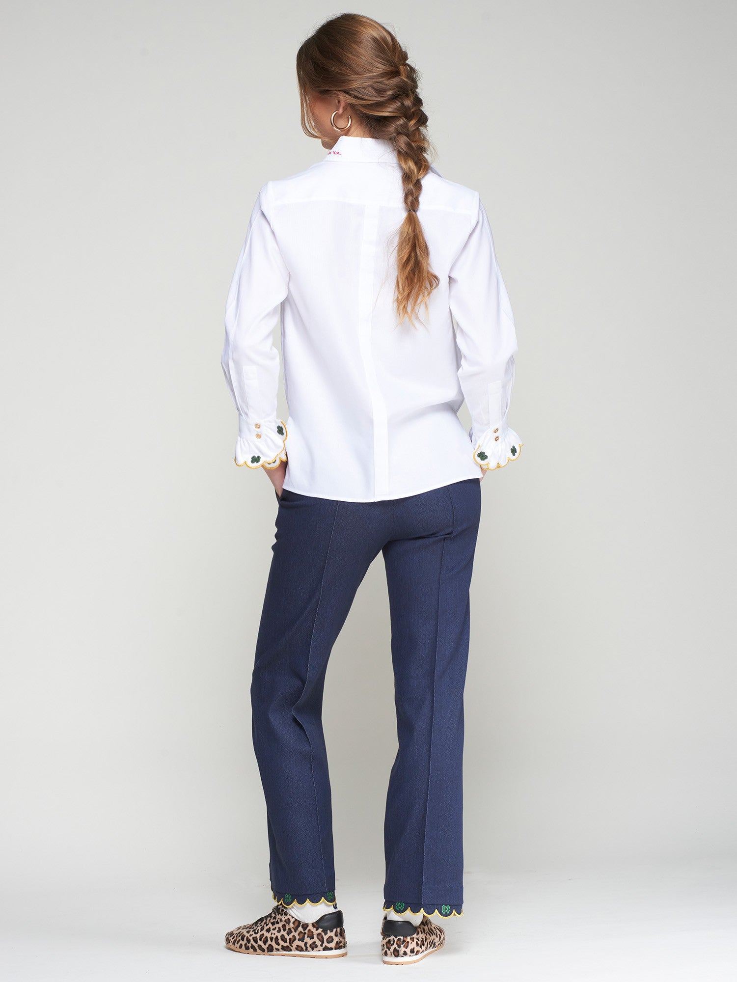 PANTALON VAQUERO AZUL OSCURO CON BORDADO DE TREBOL Y ONDAS